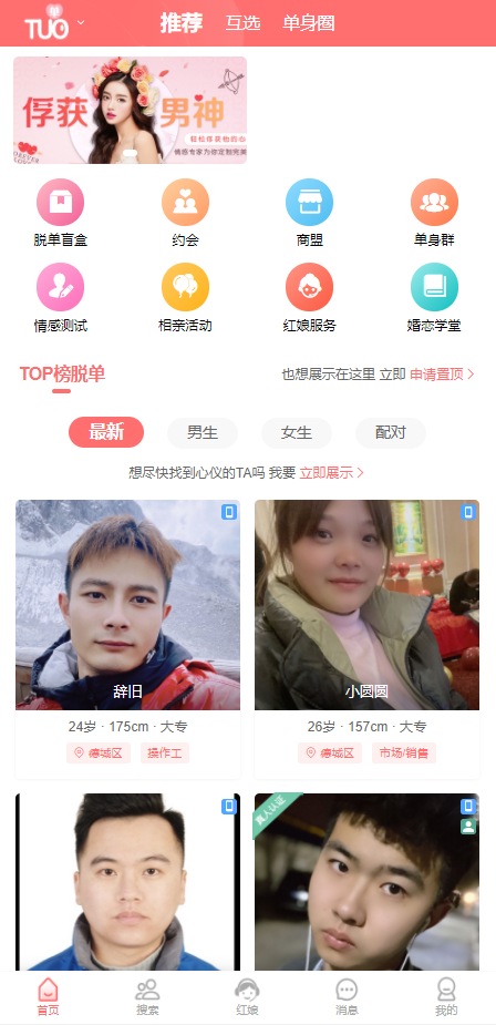 婚戀交友APP主要功能:【異性推薦】精zhun條件搜索,智能雙向匹配,輕松約到稱心如意的對(duì)象【精zhun匹配】--根據(jù)您的資料,推薦匹配異性【會(huì)員豐富】--上億單身男女,在線尋找有緣人【紅娘服務(wù)】--您身邊的貼身婚戀專家,相親就靠她【安全可靠】--嚴(yán)格身份核查,真人照片,真實(shí)資料【免費(fèi)通話】通過(guò)“密號(hào)”與心儀異性通話,...